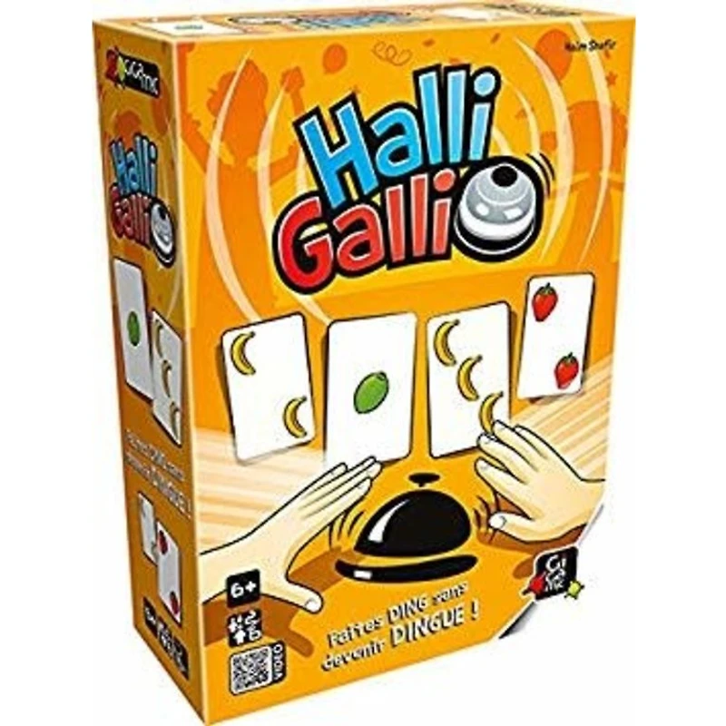 Halli Galli is a speed action game in which players watch for sets of exactly five fruit. The deck contains 56 playing cards showing four kinds of fruit in grou