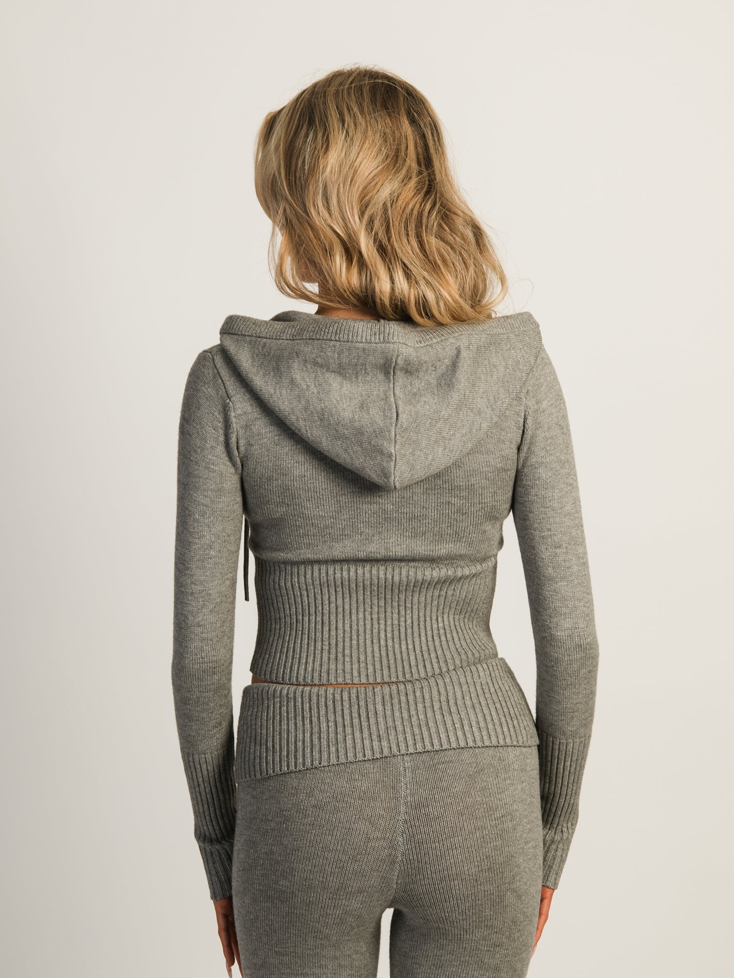The Brooke Sweater has a body sculpting knit silhouette that makes it a must-have essential. Perfect for loungewear or going out. Made in an extra soft knit and a large ribbed detailing. Pair it with its matching pants.This knit sweater features:- Body sculpting- Extra soft knit- Front zip- Hooded- Large ribbed waist a