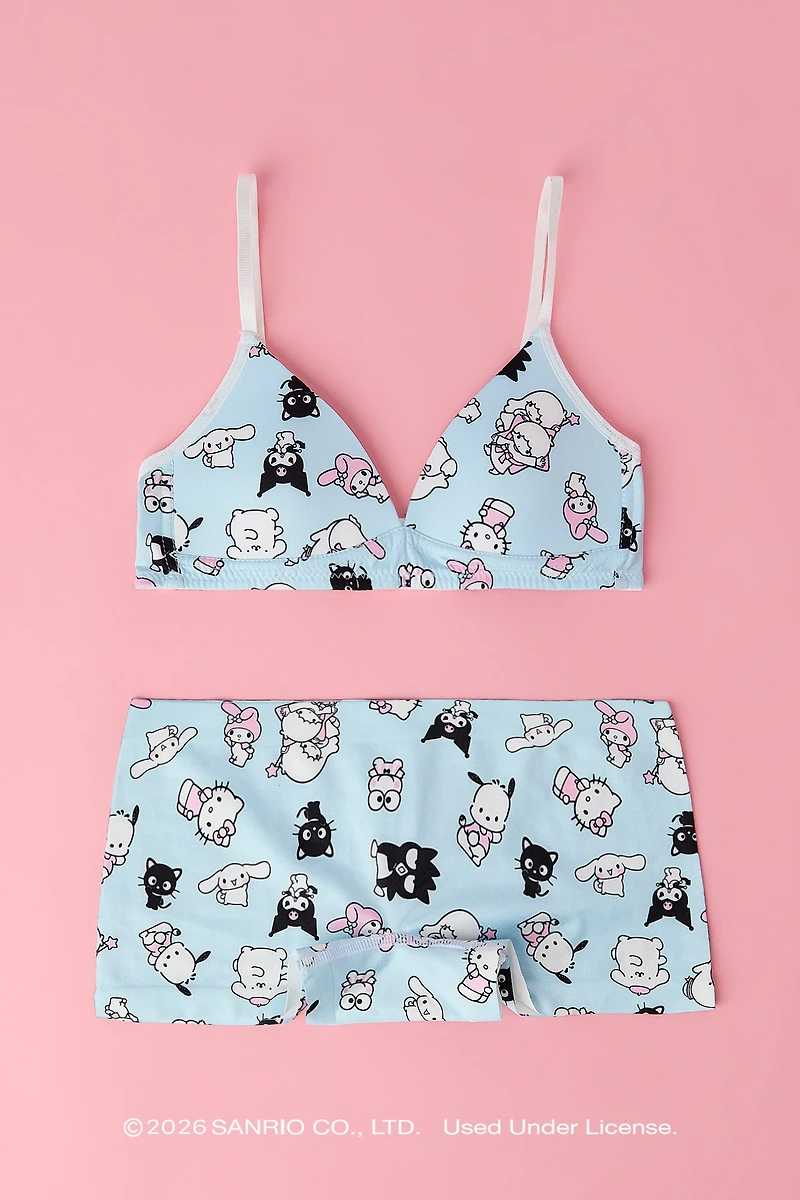 This 2-piece set comes with a bra featuring all-over print, molded cups, adjustable straps, and a matching boy short featuring all-over print and elastic waist. Pictured Size: 7/8 90% Polyester 10% Spandex Hand Wash in Cold - Wash Dark Colours Separately - Do Not Wring or Twist - No Bleach - Lay Flat to Dry ©2026 SANRIO CO., LTD. Used Under License.