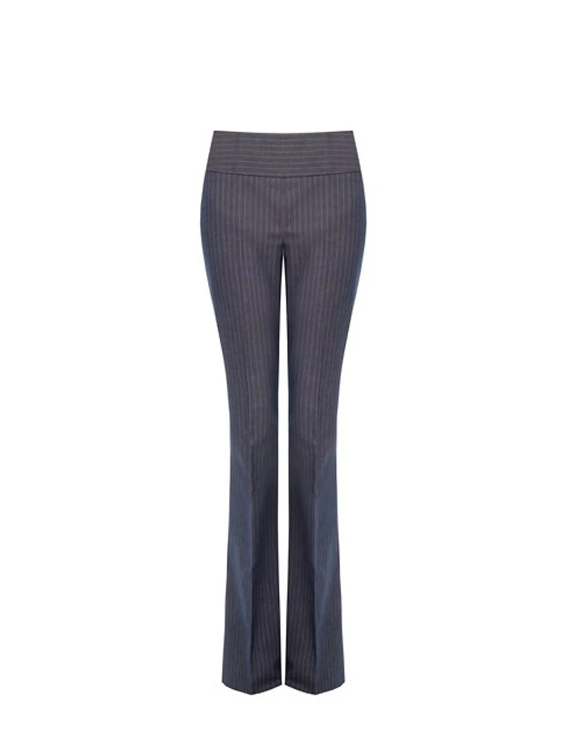 Tailored high-waisted trousers crafted in a classic pinstripe pattern for a refined, polished look. Designed with a smooth waistband and a fitted silhouette through the hips, they gently flare at the hem to create a flattering, elongated shape. Perfect for pairing with matching blazers or structured tops for a sophisticated, modern ensemble.