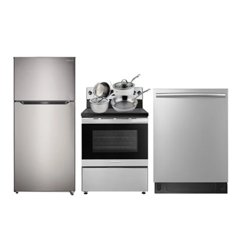 Your dream kitchen comes in this major appliance bundle from Insignia. You get the Insignia 30" 18 cu. ft. top freezer refrigerator, the 30" 5.0 cu. ft. freestanding electric range, and 24" 51dB built-in dishwasher with stainless steel tub. Plus, you get the Meyer Nouvelle six-piece cookware set. | Insignia 30" 18 Cu. Ft. Top Freezer Refrigerator; Electric Range; Dishwasher; Cookware Set - Stainless Steel