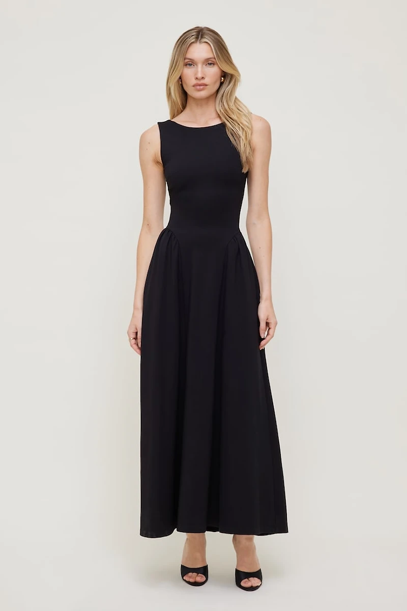 This maxi dress is made from heavyweight ponte with a soft, stretchy handfeel for a sculpting look that hugs you in all the right places. It's fitted at the bust and flares out at the waist for a flirty and flouncy feel. Pair it with a