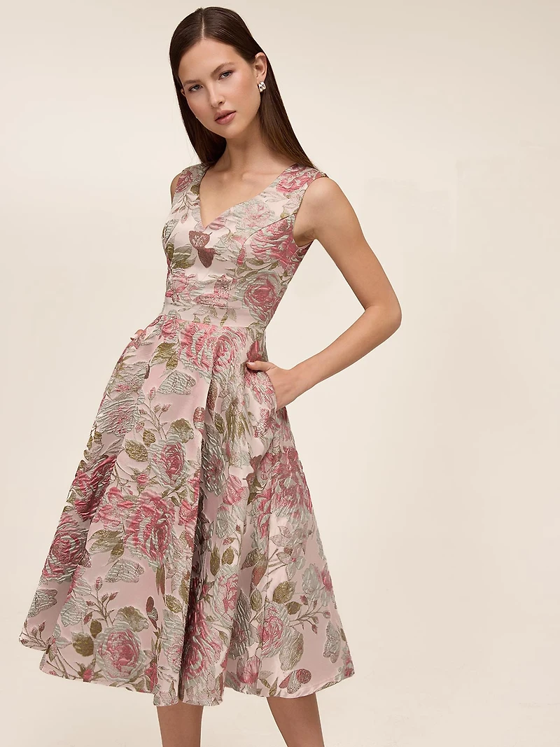 Make a refined statement in this jacquard floral midi dress, finished with a subtle metallic sheen for added dimension. The structured bodice and softly flared skirt create a flattering silhouette, while the textured floral fabric brings depth and elegance to the look. Thoughtfully designed with discreet side pockets, this dress is perfect for weddings, special occasions, and polished daytime events.