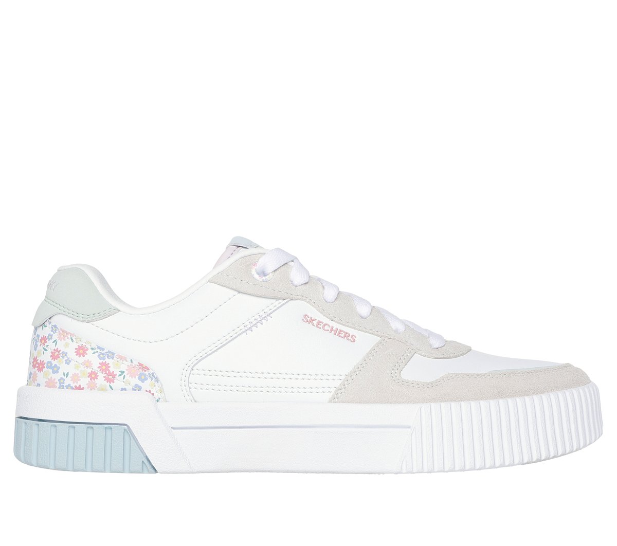 Enjoy flower adorned court comfort wearing Skechers Jade - Dainty Florals. This low-top lace-up features a color blocked duraleather and suede overlay upper with a floral print heel cup and a Skechers Air-Cooled Memory Foam® cushioned comfort insole.