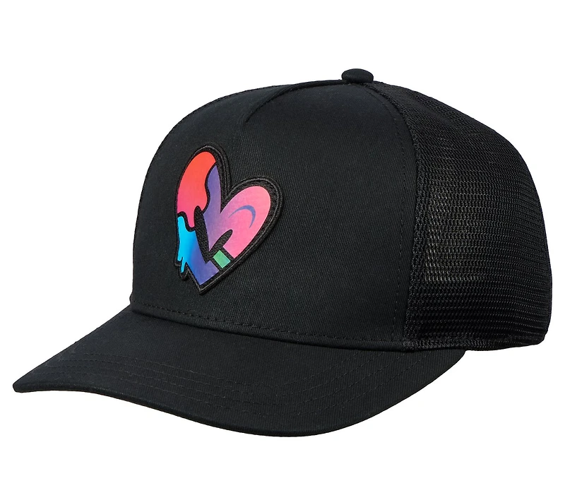 Award-winning artist Jason Naylor brings his creatively positive artwork to our most comfortable silhouettes in this colorful collaboration. Wear your love for the world to see with Skechers x Jason Naylor: Love Trucker Hat. This snapback cap features the artist's signature 'OPN Heart' design printed at the center and a classic mesh back.