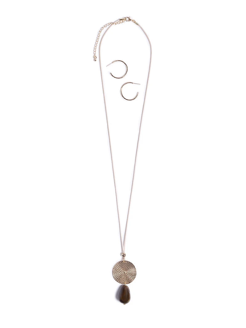 Jewelry set composed of a long necklace with a thin metal chain, lobster clasp, and adjustment chain, and a matching pair of hoop earrings. The necklace is finished with a textured circular pendant extended by a smooth dangling bead.