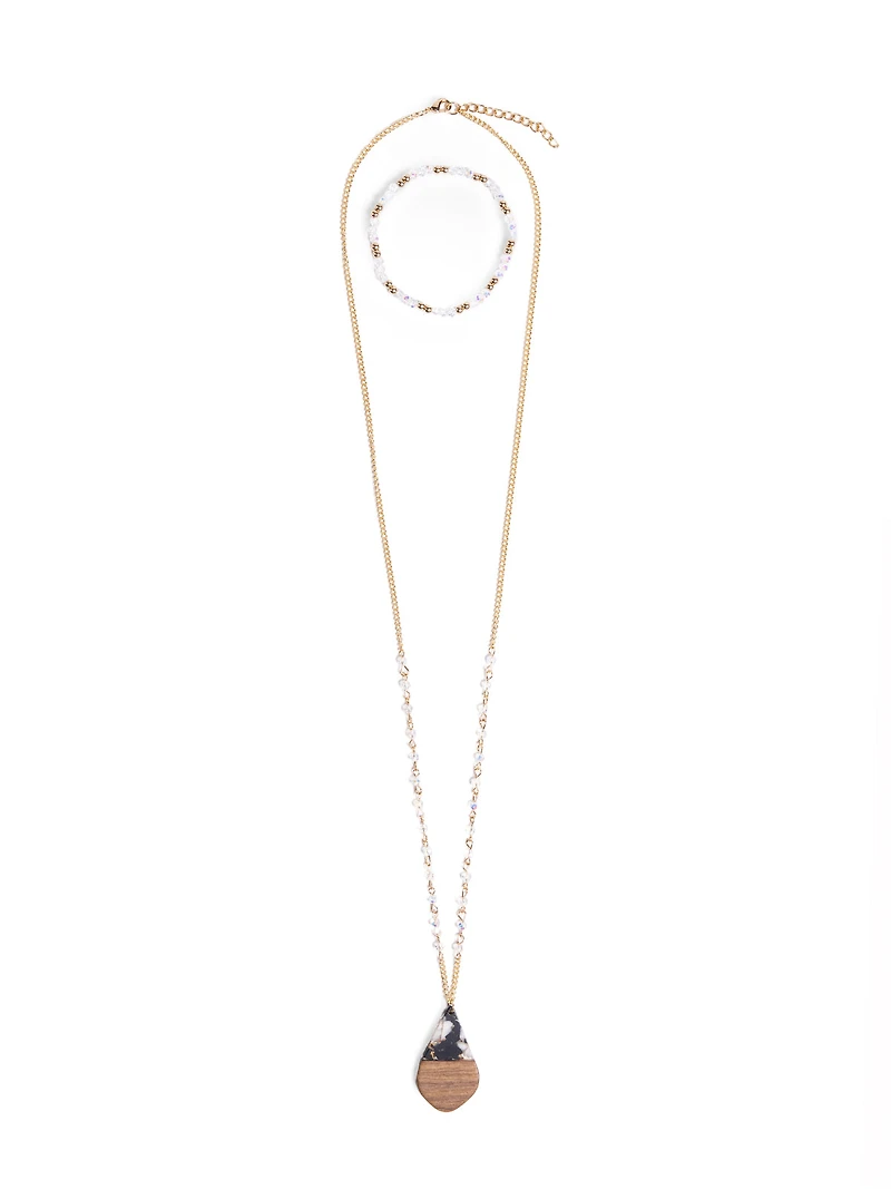 Gold-tone jewelry set featuring a long pendant necklace and a matching bracelet. The necklace is crafted with a delicate chain accented by translucent faceted beads and a teardrop-shaped pendant combining marbled resin and a wood-effect element. The bracelet echoes the design with translucent beads highlighted by round metal beads.