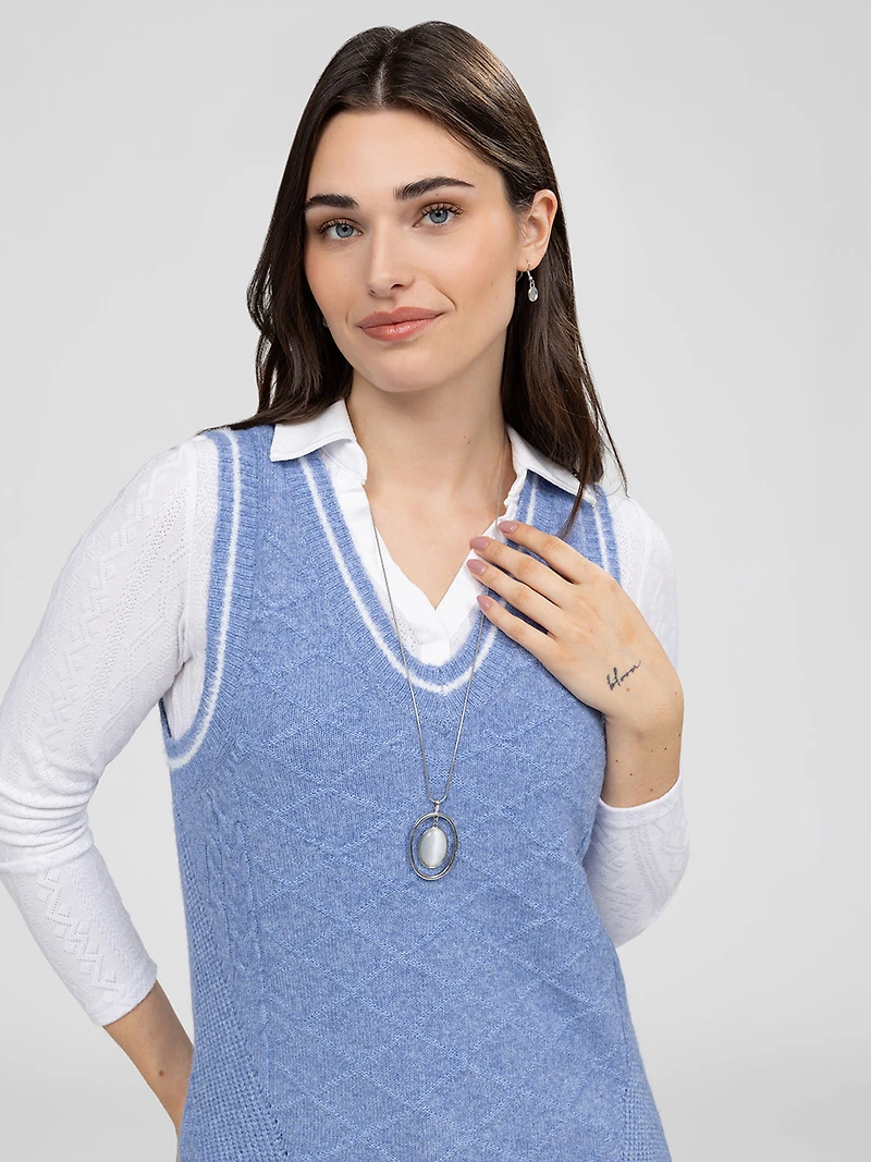 Jewelry set featuring a long necklace made of a thin silver-tone metal chain and an oval pendant with a double structure. The pendant combines a metal oval frame with a smooth central cabochon in a light shade. The set includes matching earrings featuring the same stone.