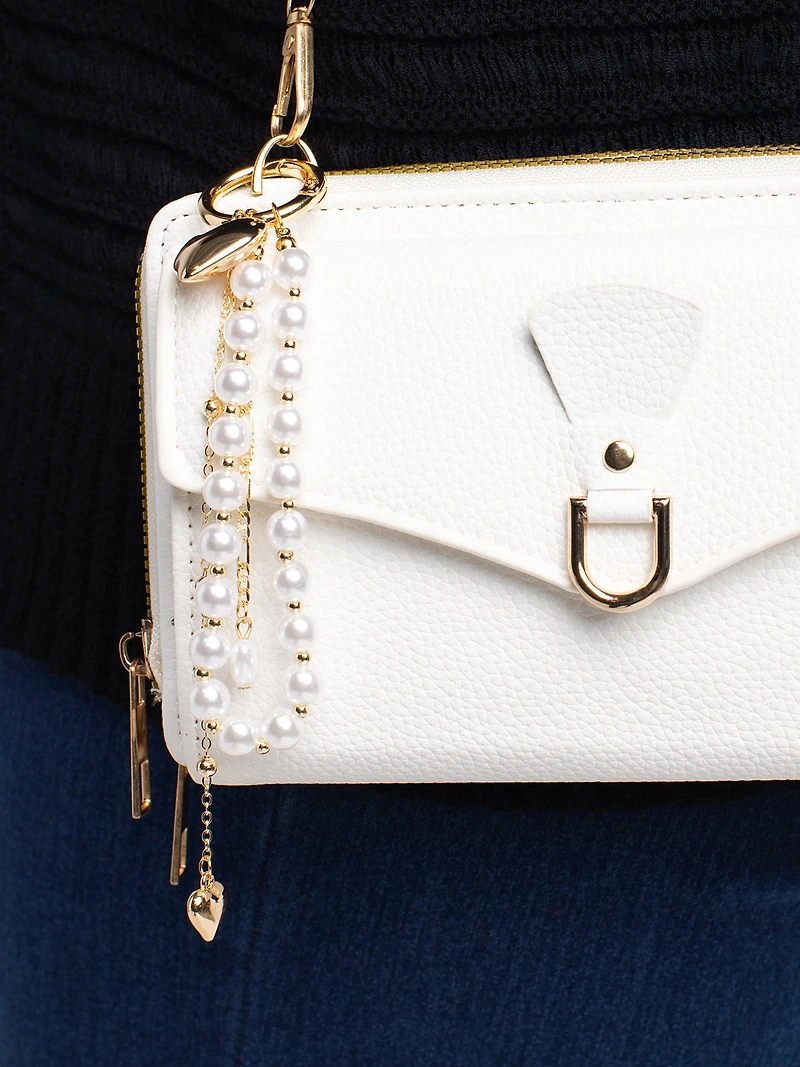 Gold-finish metal keychain featuring a circular ring and fine links. The structure includes a smooth metal heart, two hanging chains, and a strand of round white beads.