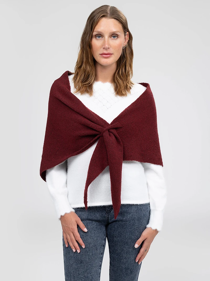 Knitted poncho with a wide triangular shape and two elongated side panels. One of the panels includes two parallel slits that serve as fastening openings.