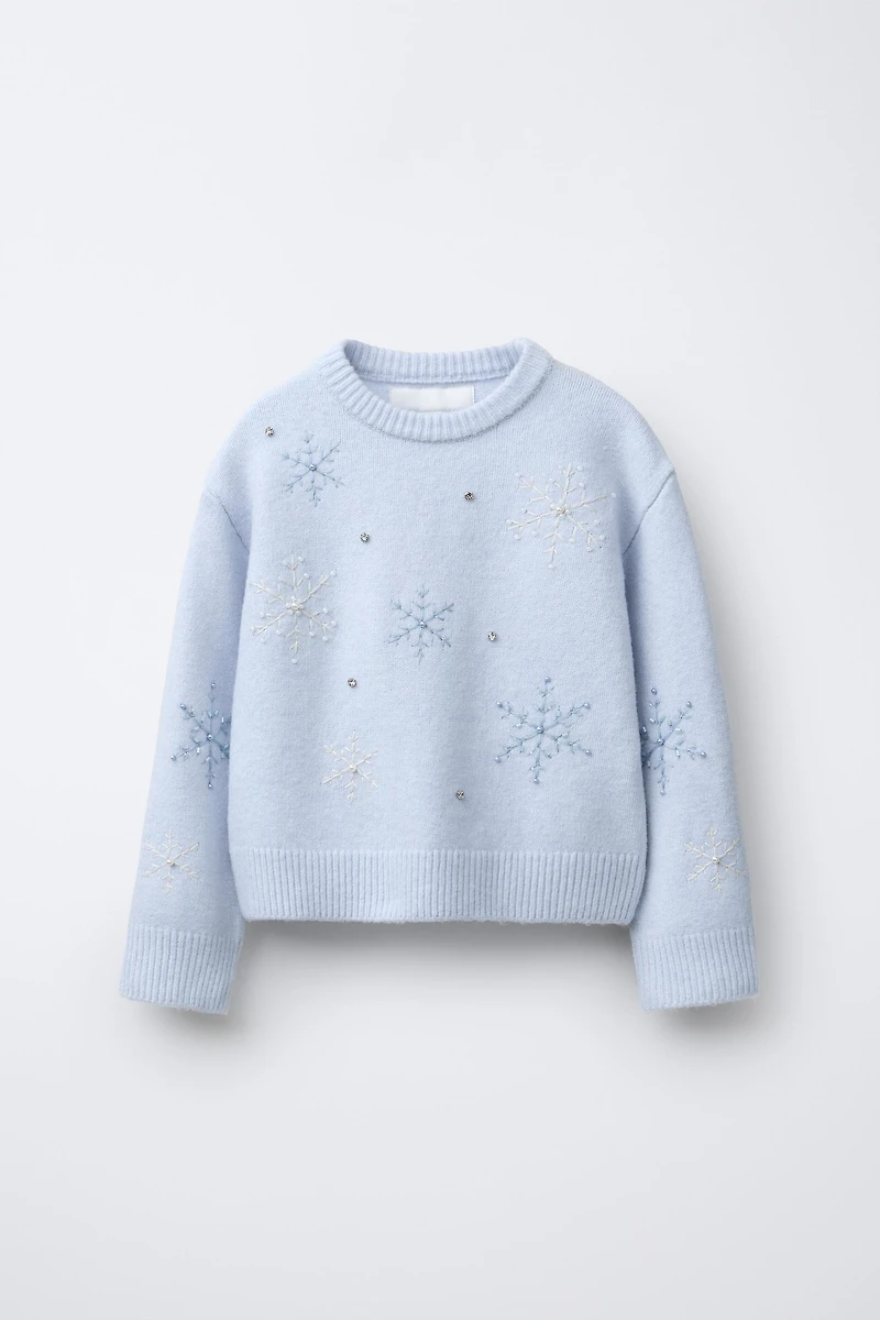Knit jumper with a round neck and long sleeves. Pearl appliqués and snowflake-shaped embroidery.