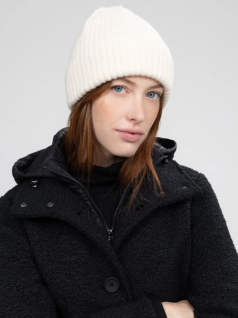 Fitted ribbed knit tuque with vertical ribs, featuring a wide cuff.
