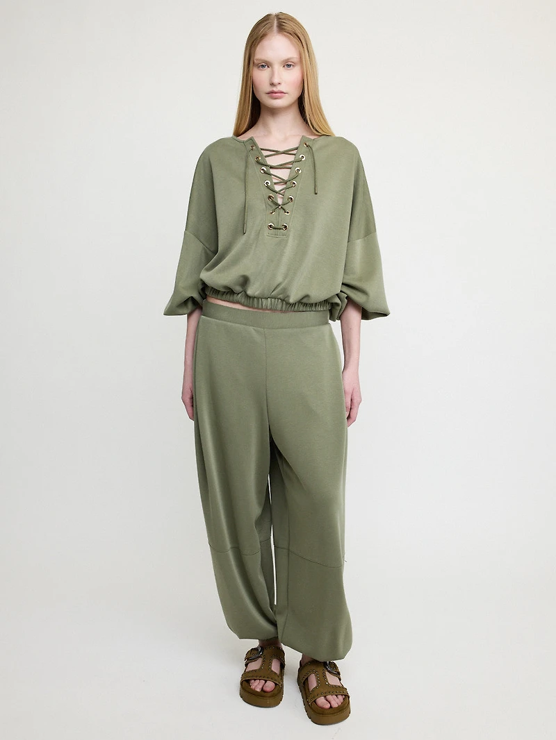Relaxed sweatshirt featuring a lace-up neckline with metal eyelet details for a modern, sporty touch. Designed with long sleeves and a softly gathered hem that creates a slightly bloused silhouette. An effortless piece to pair with denim, trousers, or casual skirts for everyday styling. Composition: 49% Polyester 44% Viscose 7% Elastane Made in Italy.