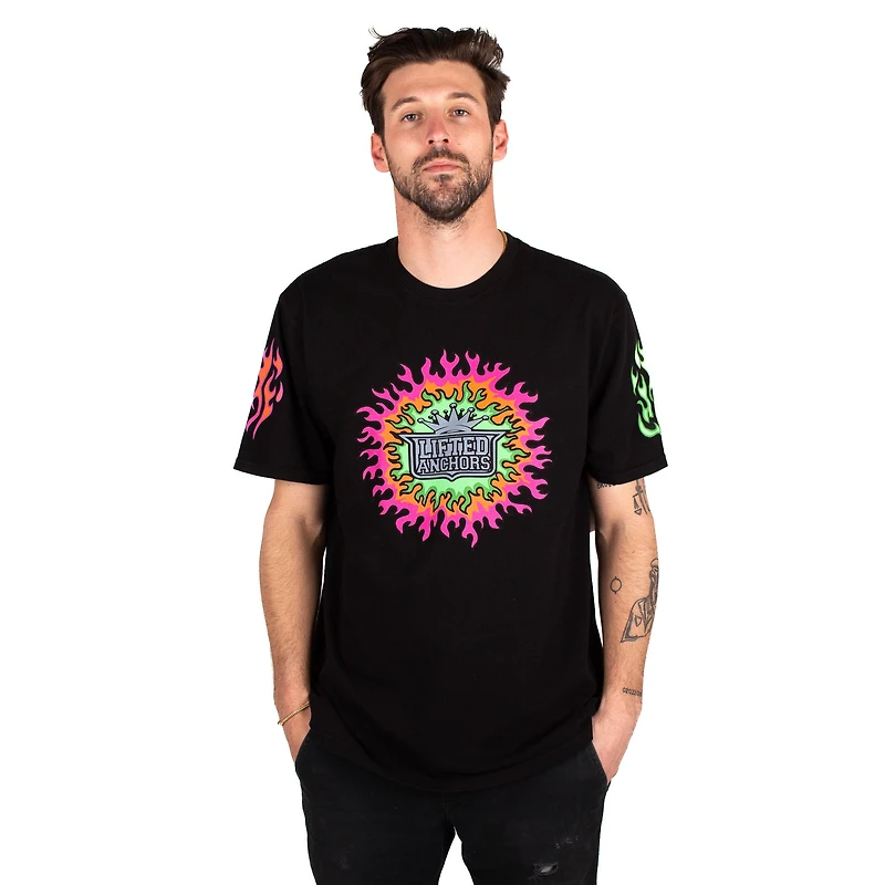 Portez l'énergie brute avec ce t-shirt sérigraphié aux couleurs vibrantes. Un logo central flamboyant encadré de motifs de flammes sur les manches, le tout sur un classique noir intemporel. Coupe décontractée et oversize, parfaite pour l'aesthetic streetwear.