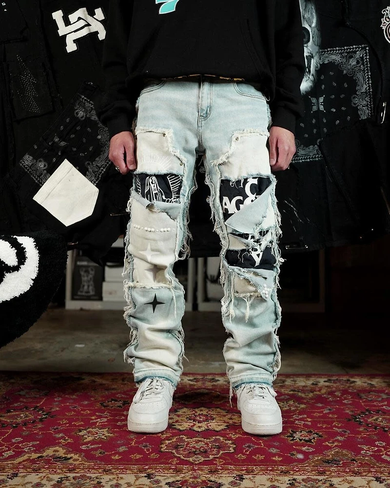 Le Rem Quilted Carpenter redéfinit l'aesthetic déconstruit avec ses larges déchirures stratégiques, patchs imprimés et détails effilochés bruts. Coupe carpenter généreuse avec 6 poches design et finitions intentionnellement usées pour un look authentiquement streetwear.