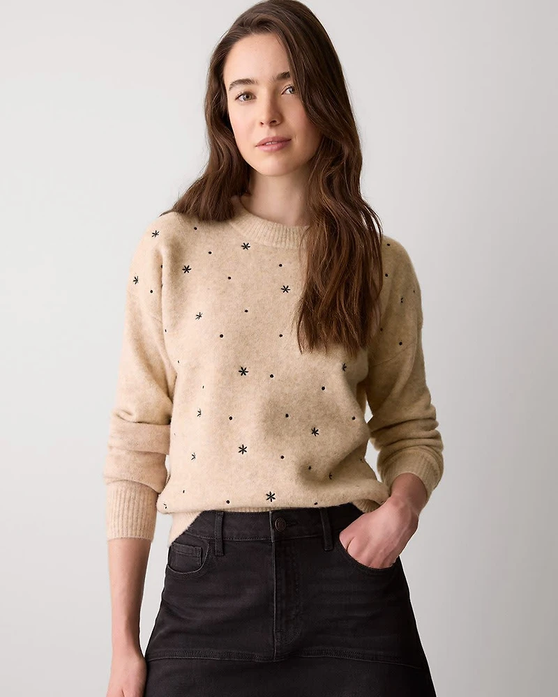 Featuring an adorable embroidered pattern, this crew-neck sweater made in an ultra-soft knit will provide you optimal comfort and a cute feminine look.