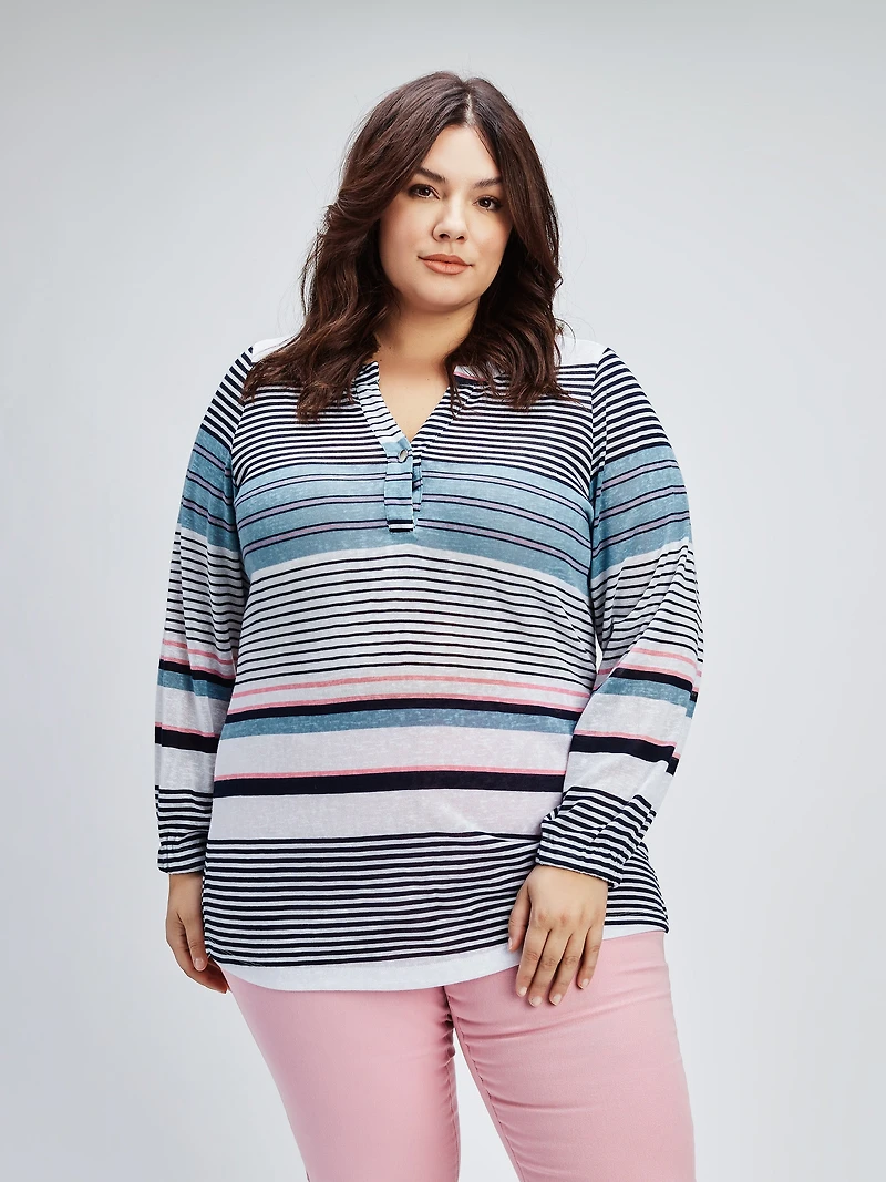This long-sleeved, semi-fitted striped tunic updates your wardrobe with casual style.