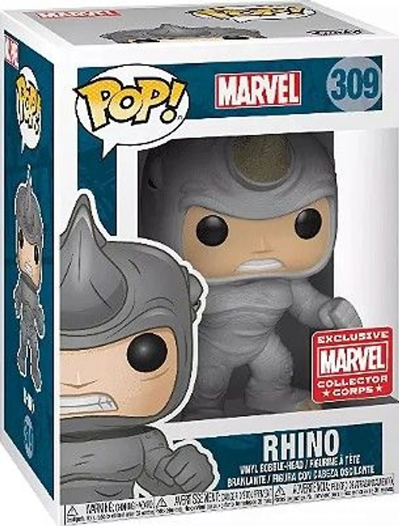 Type: Art Toys Brand: Funko Series: Pop! Vinyl , Pop! Marvel , Marvel Collector Corps Scale: 3.75" Production Status: Exclusive Reference #: 309 Released: Feb 2018 Related Subjects: Marvel , Marvel Collector Corps , Rhino (Aleksei Mikhailovich Sytsevich)