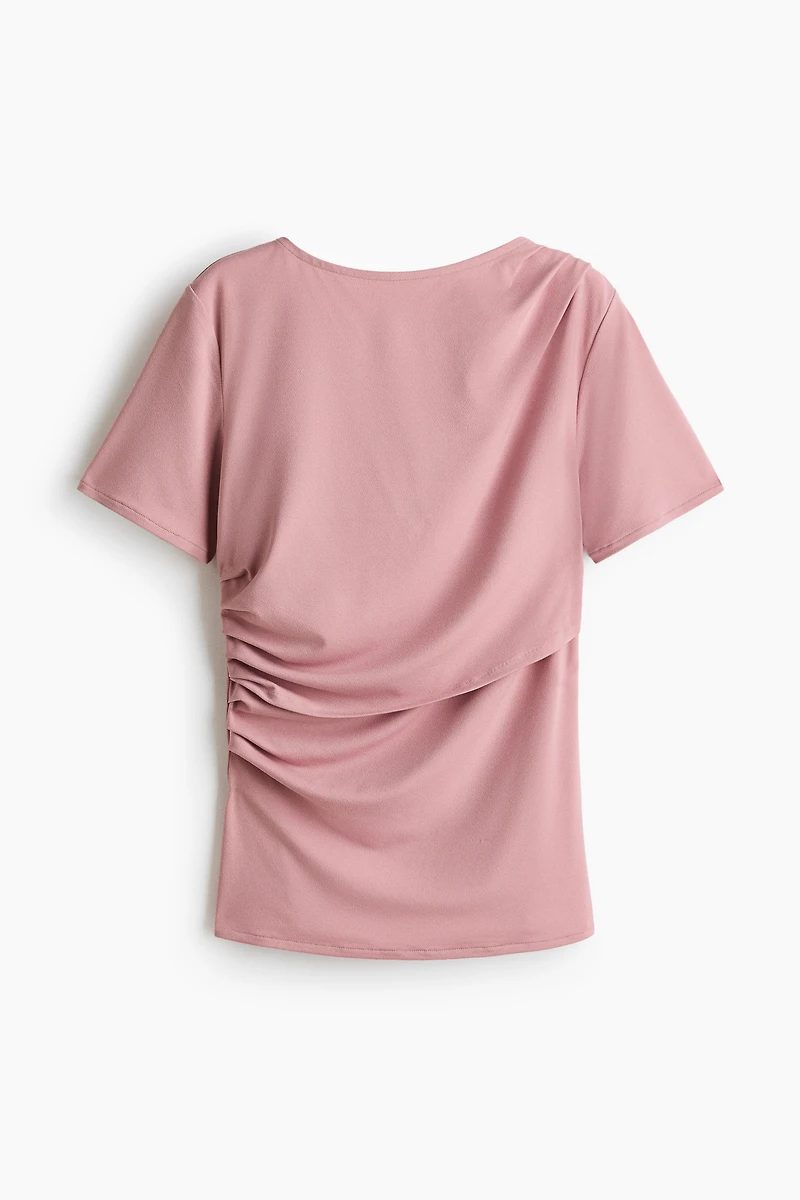 Top in crêpe jersey. Round neckline, short sleeves, and gathers on one shoulder and at opposite side of waist for a gently draped effect. Double layers at top help retain warmth while allowing easier nursing access.