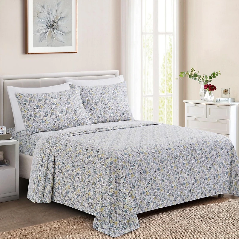 Design - This Modern Floral Patterns have Teal Yellow Flowers and Grey Leaves with White Base Decorated on It. Printed Matching Design on the Printed Pillowcases. Our 120 GSM Double Brushed Polyester and Rayon from Bamboo is Soft and Durable and Features a Breathable Weave Size and Dimension - Twin/Single Size Included 1 Flat Sheet 66 x 96 Inch, 1 Fitted Sheet 39 x 75 + 15 Inch, 1 Printed Pillowcase 20 x 30 Inch and 1 Extra Plain Pillowcase 20 x 30 Inch; Double/Full Size Included 1 Flat Sheet 81 x 96 Inch, 1 Fitted Sheet 54 x 75 + 15 Inch, 2 Printed Pillowcases 20 x 30 Inch and 2 Extra Plain Pillowcases 20 x 30 Inch; Queen Size Included 1 Flat Sheet 90 x 102 Inch, 1 Fitted Sheet 60 x 80 + 14 Inch, 2 Printed Pillowcases 20 x 30 Inch and 2 Extra Plain Pillowcases 20 x 30 Inch; King Size Included 1 Flat Sheet 105 x 102 Inch, 1 Fitted Sheet 78 x 80 + 14 Inch, 2 Printed Pillowcases 20 x 40 Inch and 2 Extra Plain Pillowcases 20 x 40 Inch Content Material - 85% Polyester and 15% Rayon from Bamboo. The bedsheets Set is Made from Ultra-Fine Weave Double Brushed Polyester and Rayon from Bamboo is Super Soft Feel, Wrinkle Resistant Feature - Deep Pockets Fitted Sheet is Fully Elastic Fitted Up to 16 Inch. Durable, No Pilling, Super Soft, Wrinkle Free, Prewashed, Fade Resistant, Hypoallergenic, Breathable. Beautifully Packed in a Zipper Bag Easy Care Instruction - Machine Washable by Cold Water. Launder Whites and Colors Separately. Use No Bleach on Colors. Tumble Dry Low