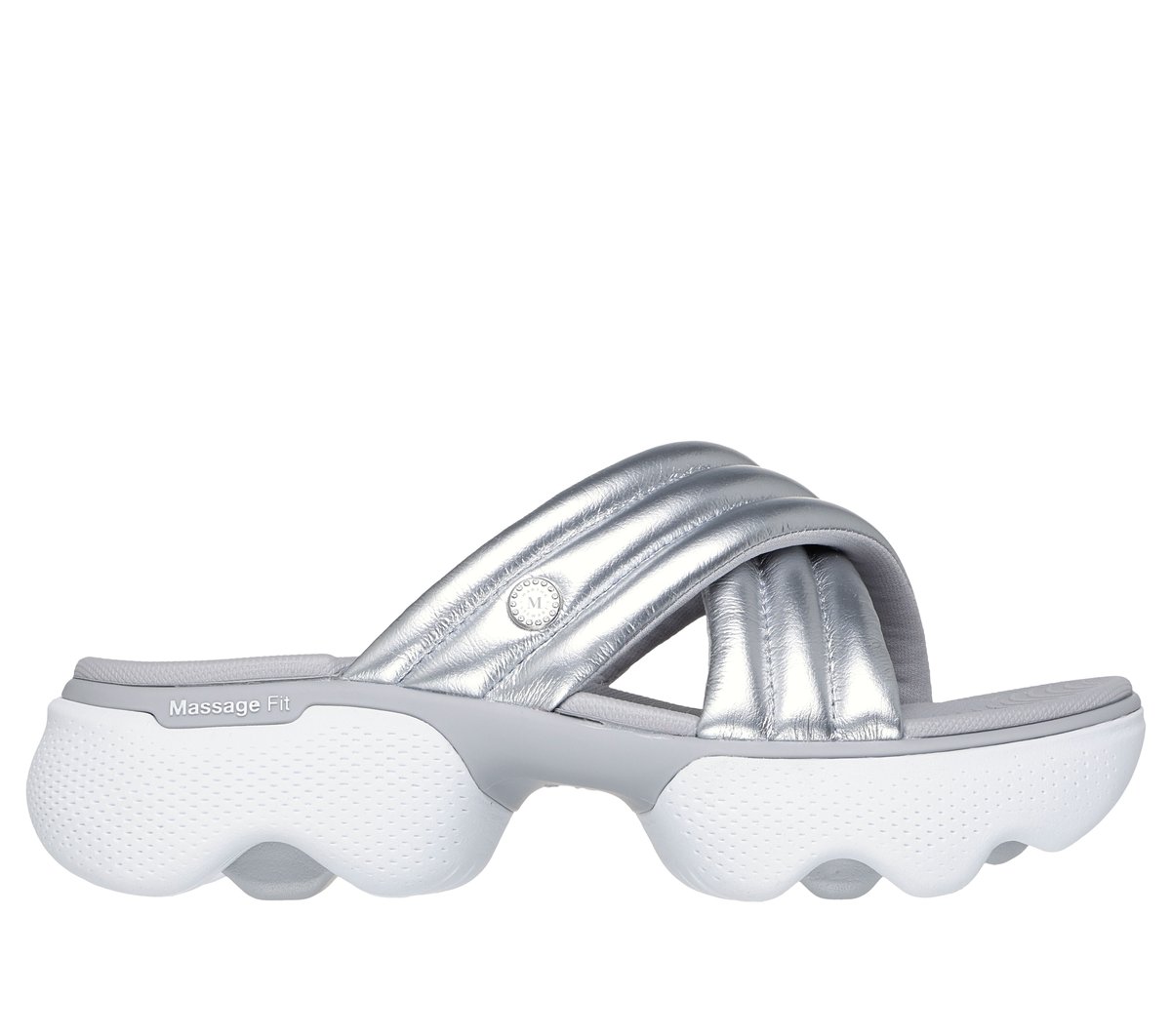Celebrated lifestyle expert, Martha Stewart, delivers her one-of-a-kind touch to Skechers in this spirited collaboration. Ease back in standout style and summery comfort with Skechers x Martha Stewart: Massage Fit Edge - Shine Bright. This vegan slide sandal features a quilted puffy upper with a metallic finish and a contoured Goga Mat® footbed with Arch Comfort® for added support.