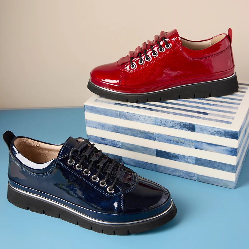 Combine boldness and comfort with Maude, Apropo's patent leather sneaker. Available in deep blue and vibrant red, this model revisits the classic sports shoe with a touch of shine and sophistication. Its thick, flexible sole ensures long-lasting comfort, while metal eyelets and a patent finish give it a modern, urban look.