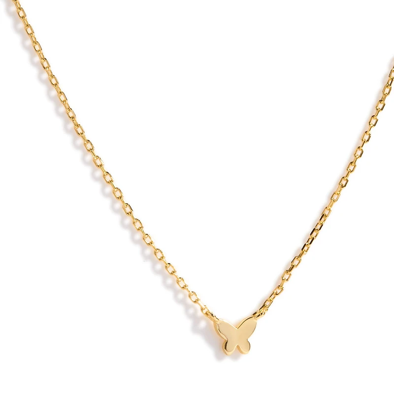 The Mélo necklace features a cable chain with a butterfly pendant. This piece is made of vermeil gold, crafted from 925 sterling silver, and plated with 14k yellow gold.