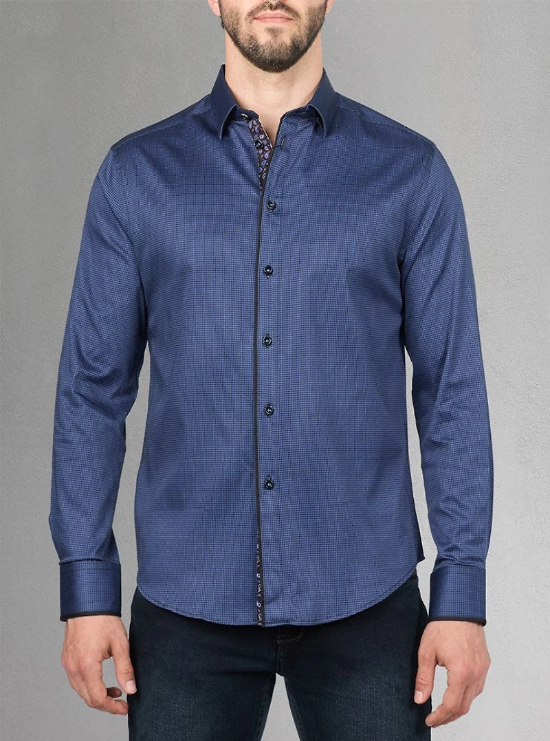 Description:This amazing shirt for men is crafted from stretch bamboo fabric featuring a mini houndstooth pattern and contrast trims. With its semi fitted cut, this shirt is both stylish and comfortable.Content:60% rayon from bamboo / 37% polyester / 3% spandexCare instruction:Machine wash in cool water. Do not use bleach. Tumble dry at low. Iron at warm temperature if needed on reverse side. Dry clean.Style:121546