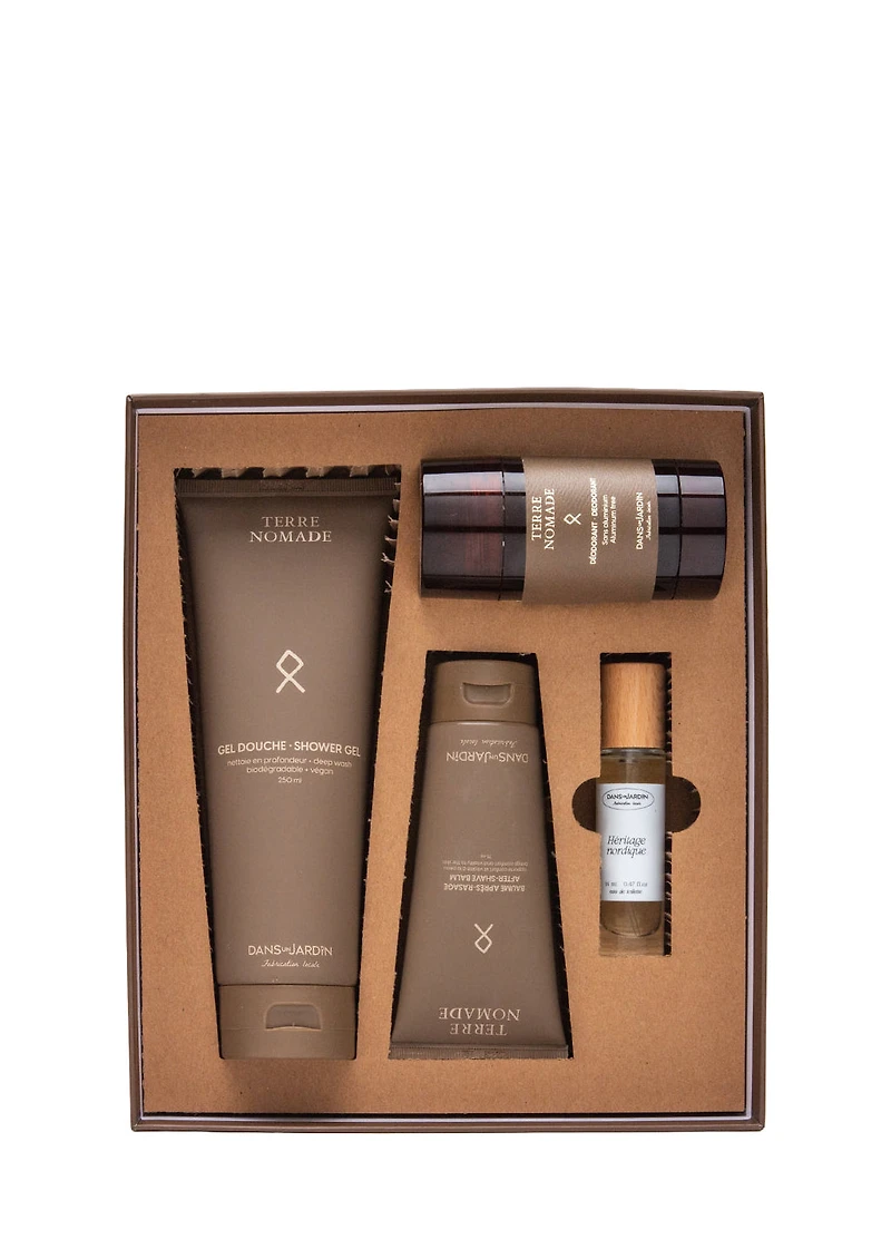 TERRE NOMADE men's gift set, including a vegan shower gel (250 ml), an eau de toilette (14 ml), a deodorant as well as an after-shave balm (75 ml) bringing comfort and vitality to the skin.