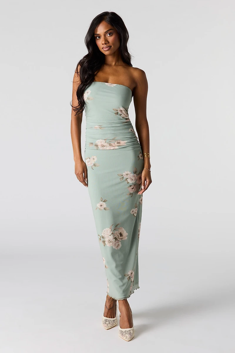 This dress features mesh material, tube neckline, ruching, and maxi length.