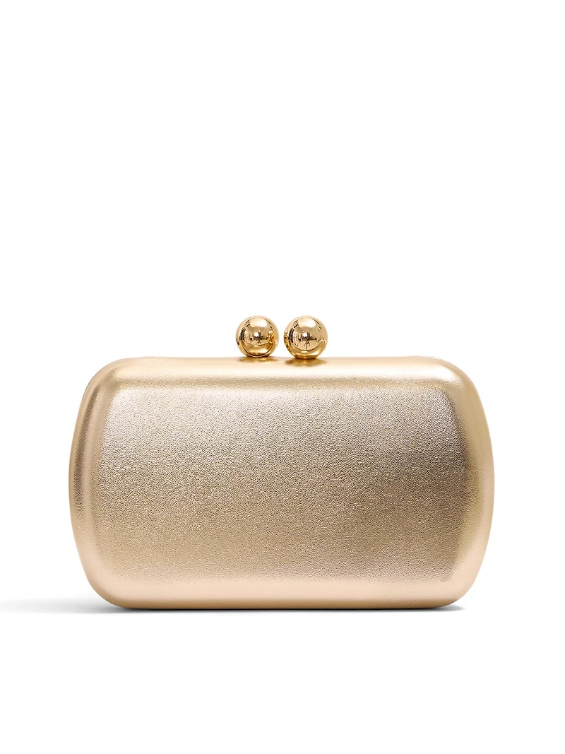 Elevate your evening ensemble instantly with this metallic gold faux-leather minaudiere, the perfect statement accessory for any special occasion. Its sleek, sculpted silhouette and radiant gold finish bring a touch of modern glam, while the elegant ball-clasp closure adds a refined, vintage-inspired detail. A must-have finishing touch for weddings, galas, and nights out where polished sophistication is key.