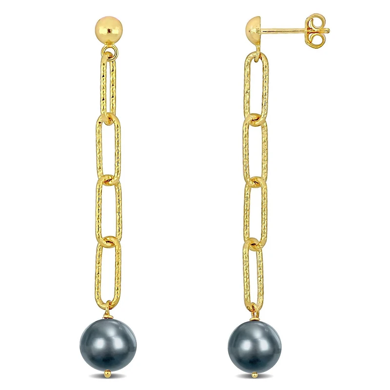Jazz up with these trendy long Miabella Dyed Grey Freshwater Cultured Pearl Oval Link Fancy Chain Earrings. Crafted in lustrous yellow gold plated sterling silver and feature two off-round-shaped dyed grey freshwater cultured pearls (9-10mm) studded above the geometric design and link with paperclip fancy chain. Buffed with luster, these gorgeous earrings are comfortably secures with a butterfly closures.Miabella Jewellery: The perfect piece of jewellery is special and stunning, accompanying you for life. With over 30 years of experience in creating fine jewellery, Miabella has what you're looking for to mark a special occasion with something that sparkles. Miabella — Harmony in jewellery. Life is a symphony, celebrate it!