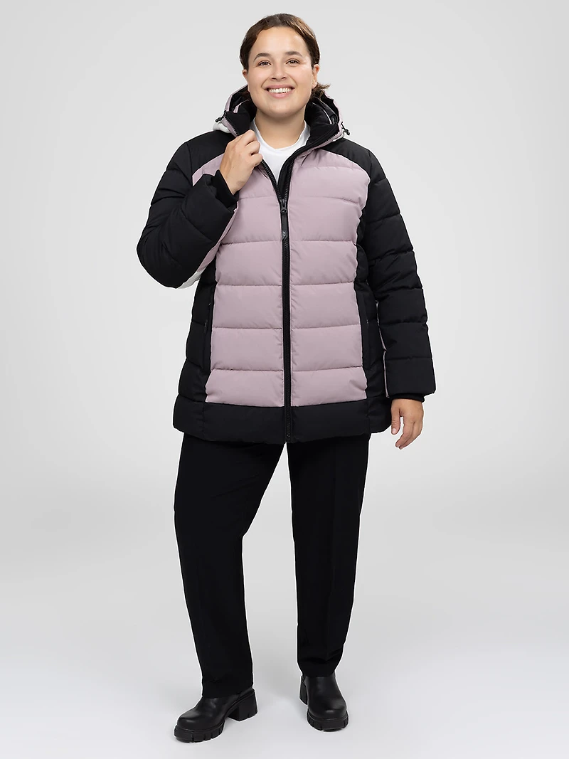 Plus-size coat with long sleeves, straight cut, and mid-thigh length. It is equipped with an adjustable hood, two-tone horizontal quilting, two side pockets, and a front zipper closure.