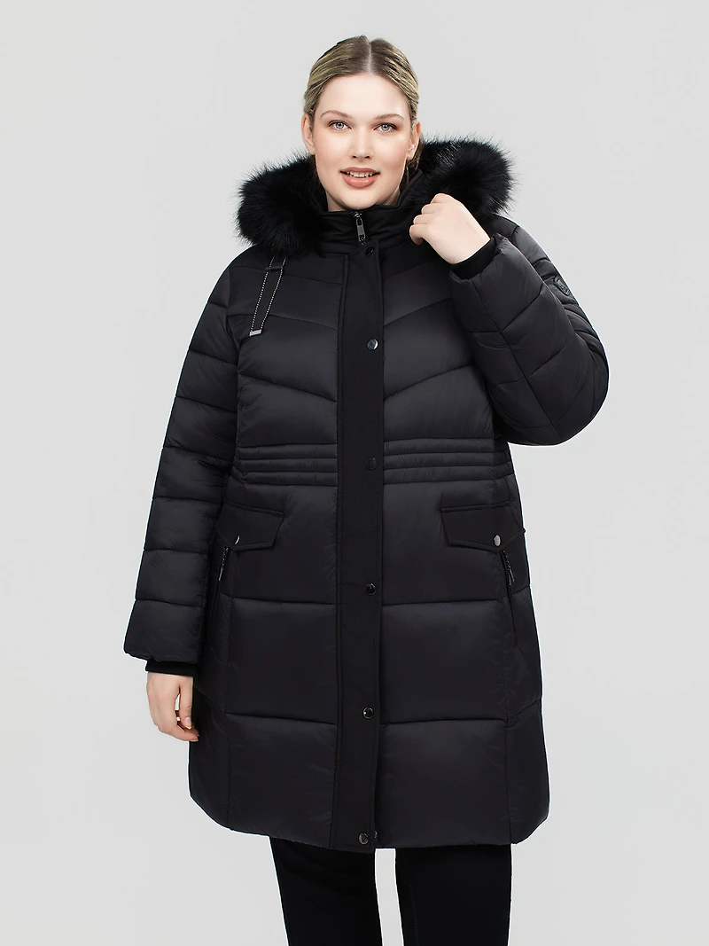 Plus-size quilted coat with a straight cut, mid-thigh length, and fixed hood with faux fur trim. It features long sleeves, a zip closure with button placket and front pockets.