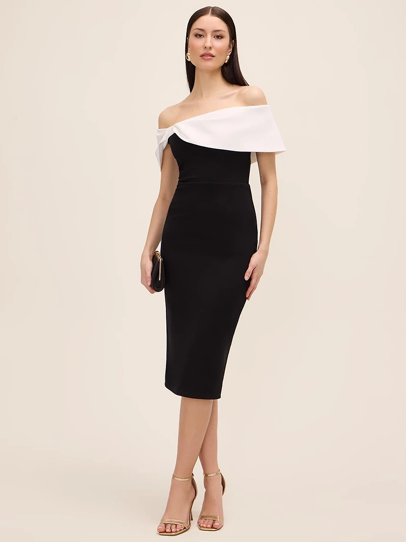 Defined by a striking asymmetrical neckline and bow detailing, this midi dress offers a modern take on occasion dressing. The sleek, figure-hugging silhouette is balanced by a bold contrast detail at the shoulder, creating dimension and visual interest. A refined statement piece designed for cocktail parties, pre-wedding festivities, special occasions, and more.Note: Le Château dresses and Suzy Shier dresses differ in sizing. Please consult our size chart for more accurate measurements.Knit crepe fabricAsymmetrical off shoulder necklineContrast bow detailSheath silhouetteMidi lengthHSP length: 45.5"Model is wearing XSFabric: 95% polyester, 5% spandexCombo: 100% polyesterLining: 100% polyesterDry clean only