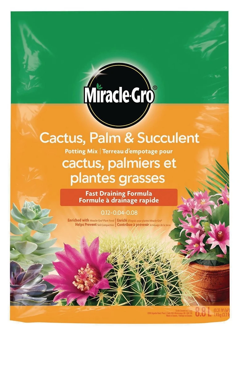 Miracle-Gro® Cactus, Palm & Succulent Potting Mix is your first step to healthy, thriving, and strong plants. This potting mix is perfect for slow growing plants that need a quick-draining soil, and resists soil compaction to support healthy root structures. Enriched with Miracle-Gro® plant food with an N-P-K balance of 0.07-0.03-0.05, this potting mix is the perfect match for desert plants, feeding them the right amount of nutrients, instantly. One 8.8-liter bag contains enough soil mix for two 20 centimeter pots, making it easy to fill your home with a bounty of desert beauty.