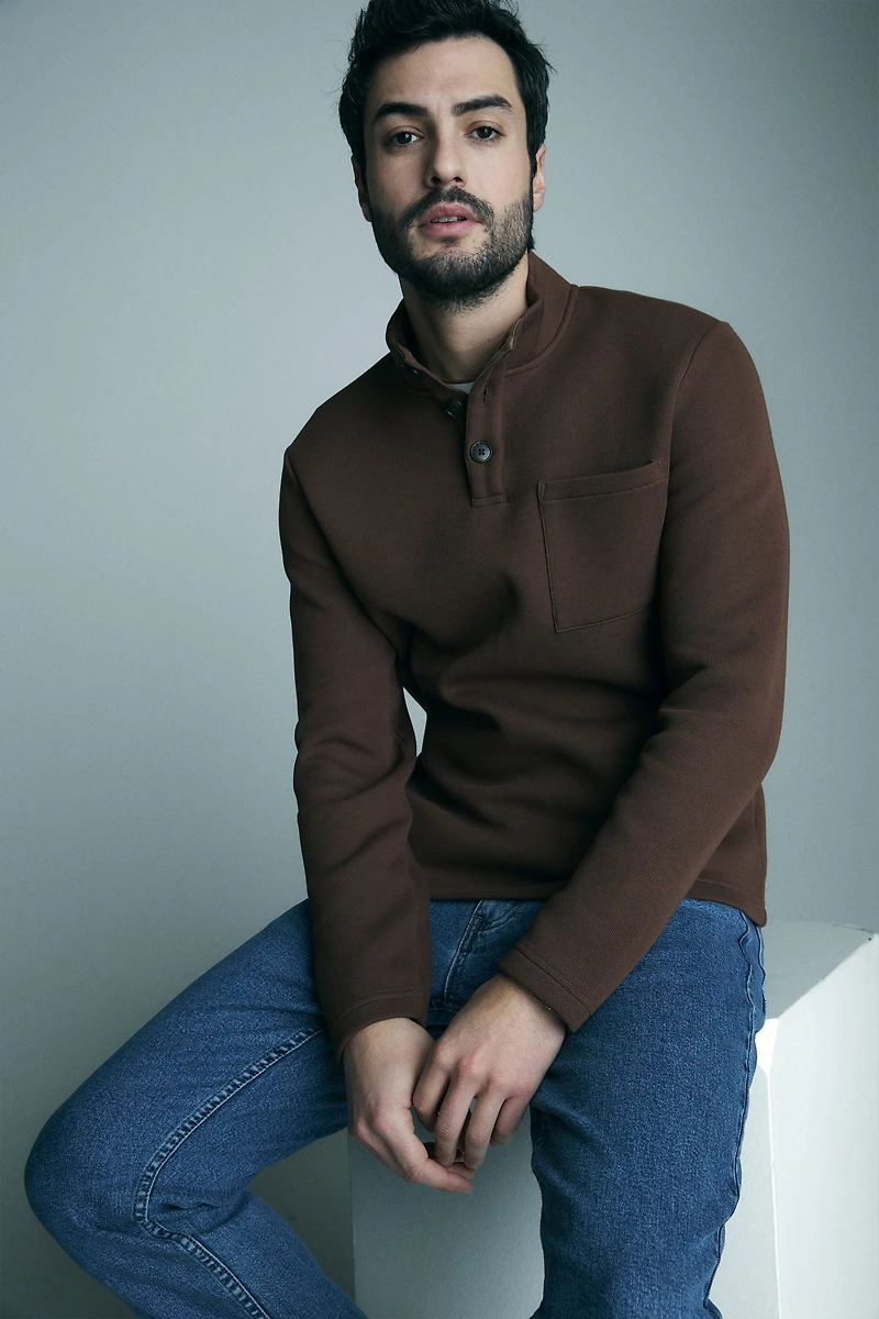This mock-neck t-shirt stands out with its subtle buttons that add a touch of character while keeping the look refined. Made from a soft and comfortable fabric, it can be worn on its own or layered with ease. A perfect everyday piece that blends function and modern design for a casual yet polished look.