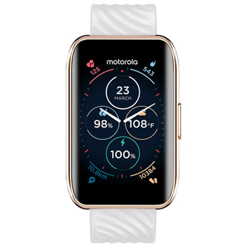 Achieve your fitness goals with this Motorola Moto Watch 40 smartwatch. It has a large, 1.57-inch LCD to clearly view the information displayed. The stylish zinc alloy case improves durability, and the interchangeable breathable strap enhances wearing comfort. This smartwatch seamlessly integrates with Google Fit. | Motorola Moto Watch 40 46 x 30mm Smartwatch with Heart Rate Monitor - Rose