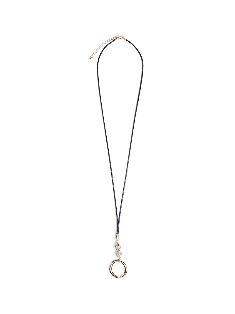 Necklace with a thin black cord and a lobster clasp with extension chain. Pendant composed of two speckled beads aligned above a suspended gold-tone metal ring.
