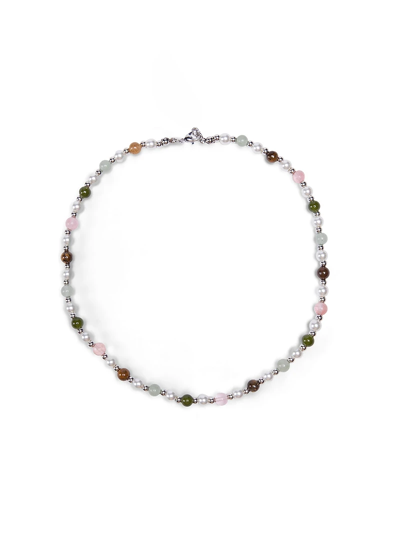 A continuous-strand necklace featuring colorful stones, separated by small metal beads. Symmetrical assembly with repeating patterns and a metal clasp.