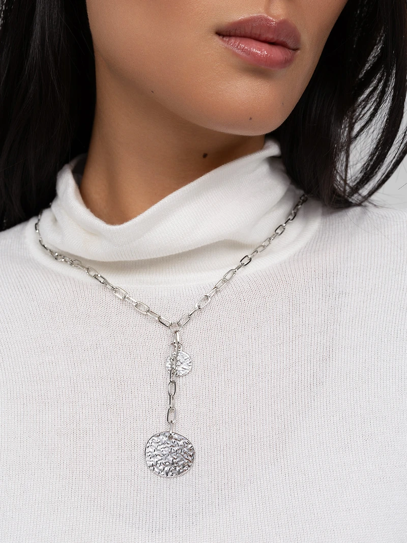 The necklace is made of elongated metal chain links with a hammered circular pendant attached to a central extension. A second smaller metal disc is fixed along the same axis.