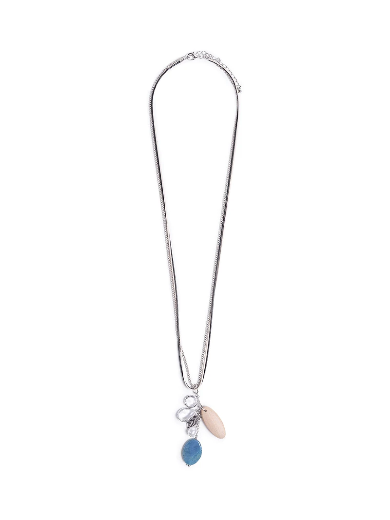 Multi-chain necklace featuring an oval blue stone pendant, a clear pearl, two faceted transparent elements, a metal leaf charm, and an oval wooden element.