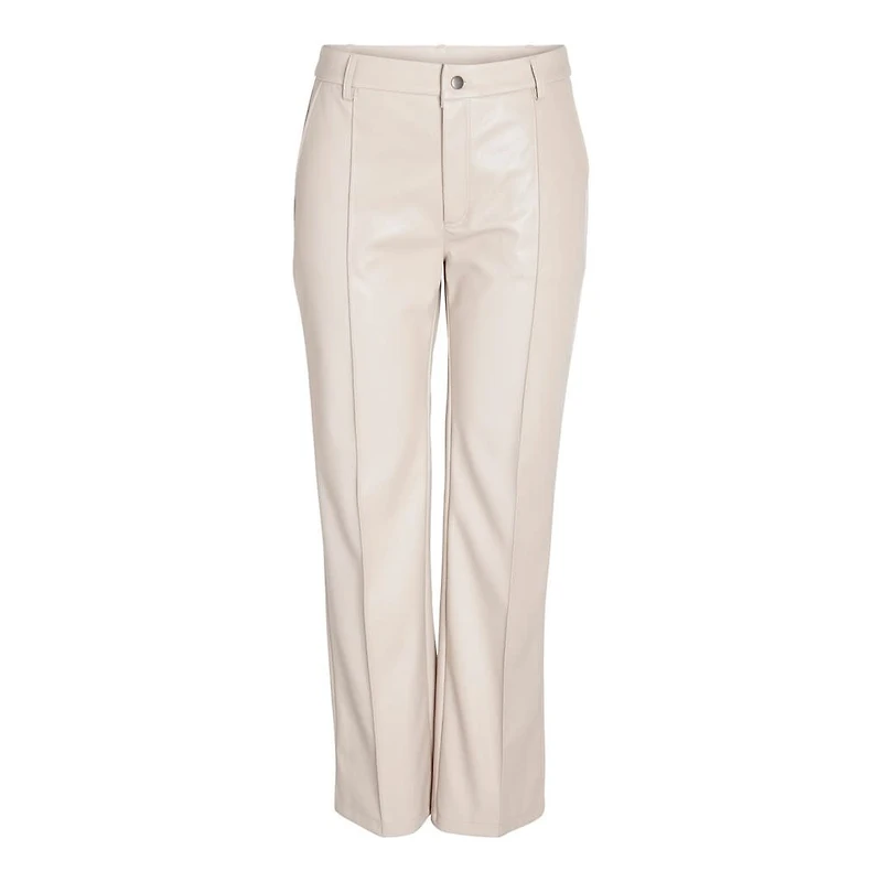 Un pantalon taille haute épuré en matière synthétique brillante. Coupe droite et allongée avec plis marqués à l'avant, poches latérales fonctionnelles et fermeture classique. Détails couture contrastée pour une silhouette structurée et intemporelle.
