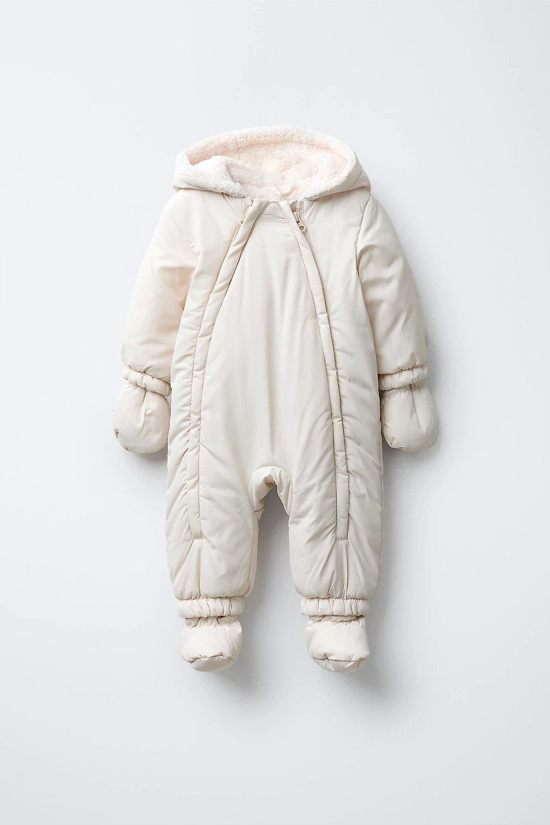 Romper with hoodie and long sleeves with elastic cuffs. Front zip closure. Detachable mittens and booties with snap buttons. Fleece lining.