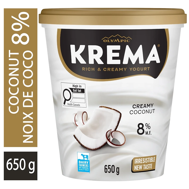 Olympic Krema 8% M.F. Coconut Yogurt is a rich and creamy yogurt that uses high-quality ingredients and the goodness of dairy to satisfy your most indulgent cravings. Made without gluten, gelatin, or preservatives, Krema's thick and creamy yogurt is a satisfying snack you can always feel good about. Keep this convenient 650g tub of high-fat yogurt on hand to enjoy on its own, with fruit, or as a standout ingredient in a deliciously decadent dessert.