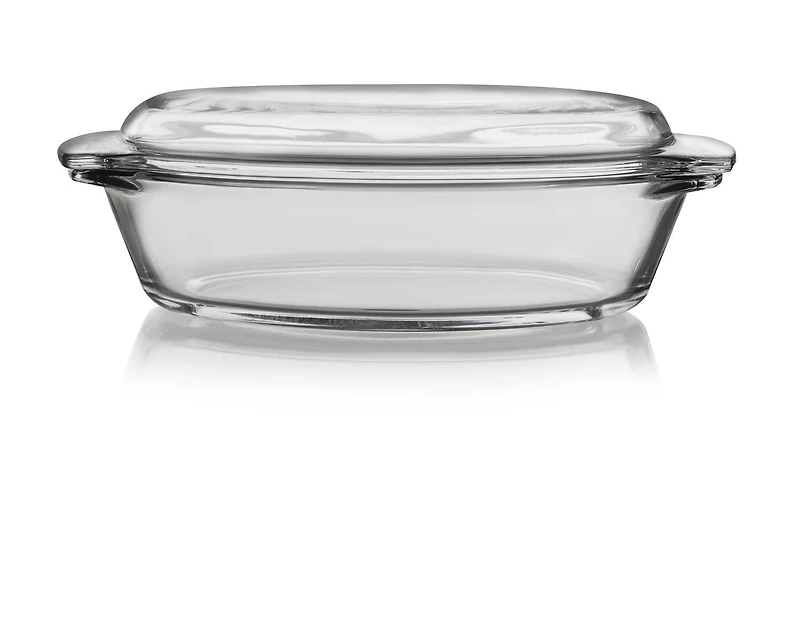 The Libbey Baker's Basics Glass Oval Casserole with Cover takes your creations from oven to tabletop. Clear glass walls allow you to watch food cook from all sides, and the glass cover keeps your cuisine moist and juicy. Use the handles to bring the attractive oval casserole dish right to your table. Revolutionary glass construction makes it safe for the oven, microwave, refrigerator and freezer. This set is stackable, extremely durable and dishwasher safe for quick, easy cleanup. Includes 1, 1.5 litre glass oval casserole with glass cover (6.9-inch/17.6 cm width x 10.9-inch/27.7 cm length x 2.5-inch/6.4 cm height dish; 7-inch/17.8 cm width x 11.3-inch/28.9 cm length x 1.2-inch/3 cm height lid).