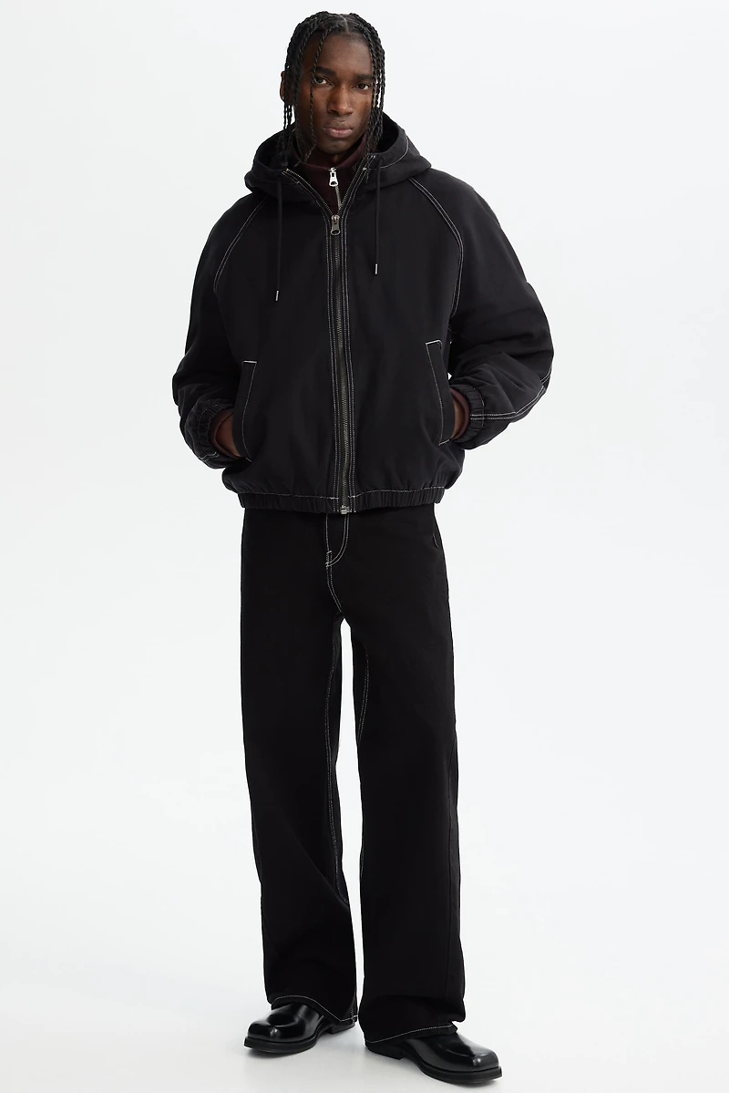 Lightly padded jacket in thick cotton canvas with accent-color stitching. Drawstring hood, zipper at front, and raglan sleeves. Welt side pockets with concealed snap fastener and an inner pocket with concealed snap fastener. Covered elastic at cuffs and hem. Quilted lining.