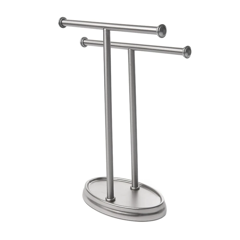 Keep hand towels neat and at the ready with the Palm towel tree by Umbra. Constructed of metal with a nickel-plated finish, Palm features two tiered bars that accommodate hand towels or washcloths. Perfect in the guest bathroom or powder room, Palm is also useful in any bathroom where wall-mounted hardware is not feasible or desirable. The nickel finish coordinates with a variety of other bathroom hardware items available from Umbra. Measures 10-1/2 inches by 4-1/4 inches by 3-3/4 inches. Designed by Alan Wisniewski for Umbra - original, modern, casual, functional and affordable design for the home.