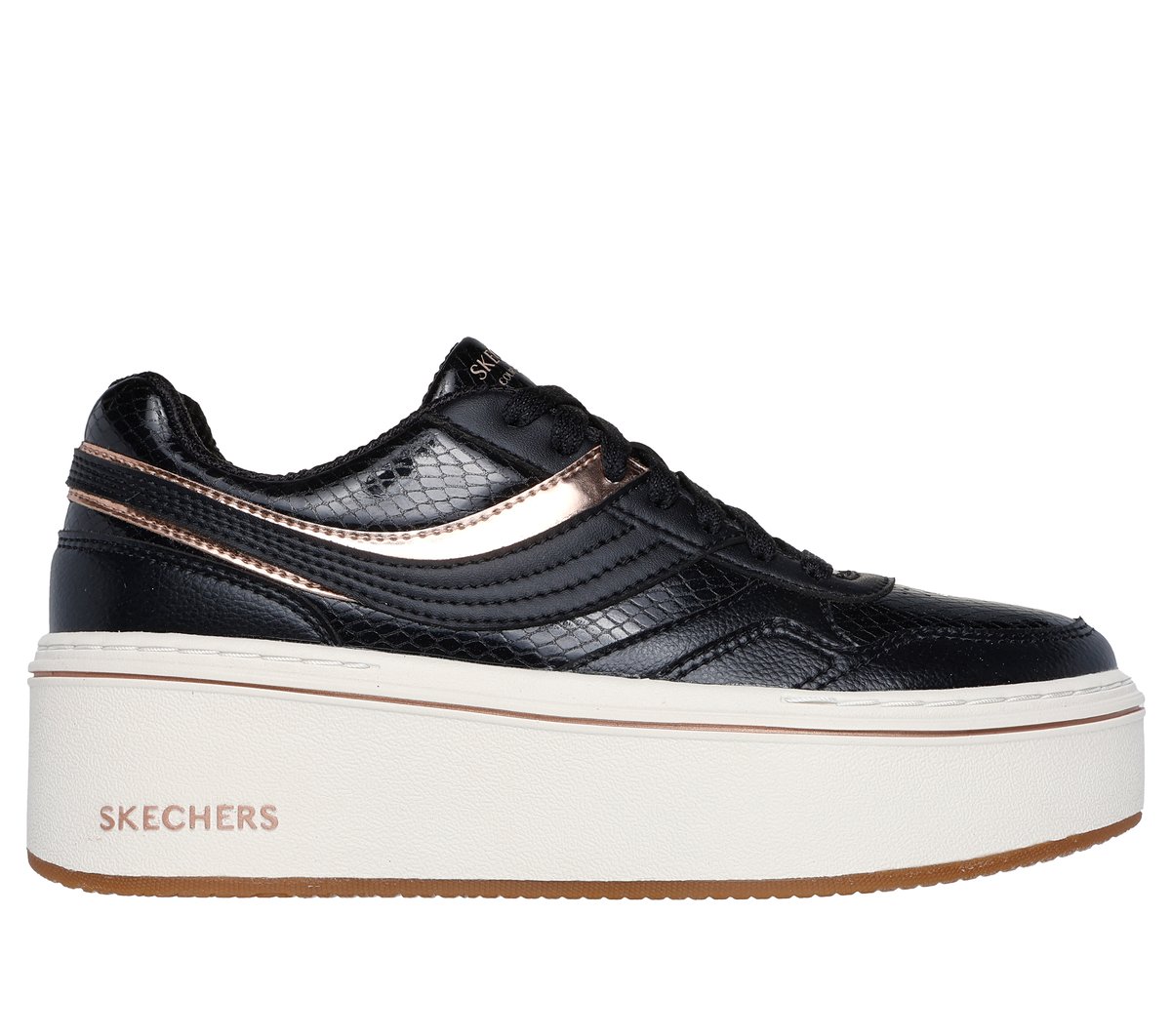 Reach new heights of style with Skechers Paloma - Lifted Glow. This platform court sneaker features a lace-up duraleather upper with reptile textured details and metallic overlays, plus a cushioned Skechers Air-Cooled Memory Foam® comfort insole.