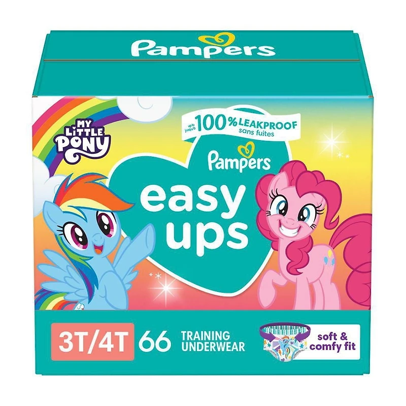 Start your potty training journey with Pampers Easy Ups Potty Training Underwear for Girls and Boys! Featuring your favorite characters – Bluey and My Little Pony - these super soft, comfortable, and breathable training pants fit just like real cotton underwear allowing your toddler to feel like they have transitioned out of diapers! With a 360 stretchy waistband that is gentle on your child's skin, Easy Ups make it easy for your toddler to pull up and down their training pants independently. For easy changing, Easy Ups feature easy tear sides for convenience, even on the go! When it comes to potty accidents, your toddler will be covered with up to 100% leakproof protection Day OR Night. To protect where leaks happen most, Easy Ups are made with Dual Leak-Guard Barriers around the leg cuffs and Extra Absorb Channels for all around coverage to absorb accidents and lock them away from your toddler's skin. Plus, they're dermatologically tested, hypoallergenic, and free of parabens and latex.* That's just one of the many reasons Pampers is the #1 pediatrician recommended brand. Toilet training is a journey and can take your toddler 90 days on average to catch on. So, Pampers Easy Ups makes it easy with each box containing a one-month supply of training pants. Available in sizes 2T-3T (16-34 lb), 3T-4T (30-40 lb), 4T-5T (37+ lb) and 5T- 6T (41+ lb).*Natural Rubber